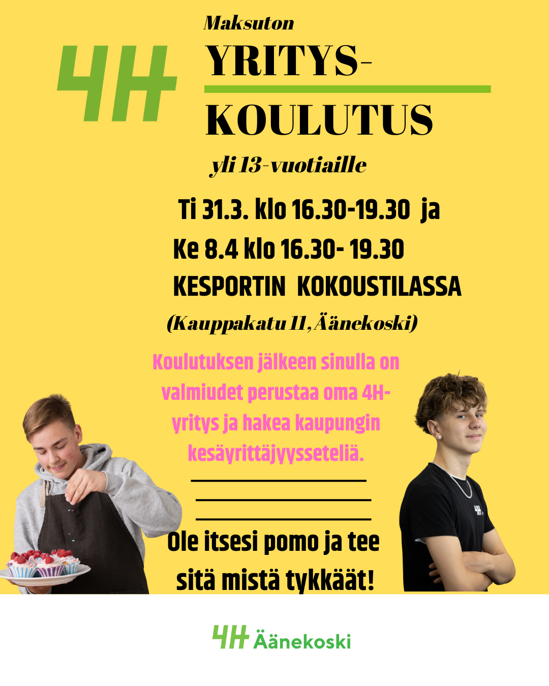 Kiinnostaako oman firman perustaminen? Tule mukaan 4H-Yrityskoulutukseen! 🗓️ Milloin? 👉 Ti 31.3 & Ke 8.4. 🕠 Klo 16.30–19.30 📍 Kesportin/Powerin kokoustila 👩💻 Mitä luvassa? Kahden illan aikana…