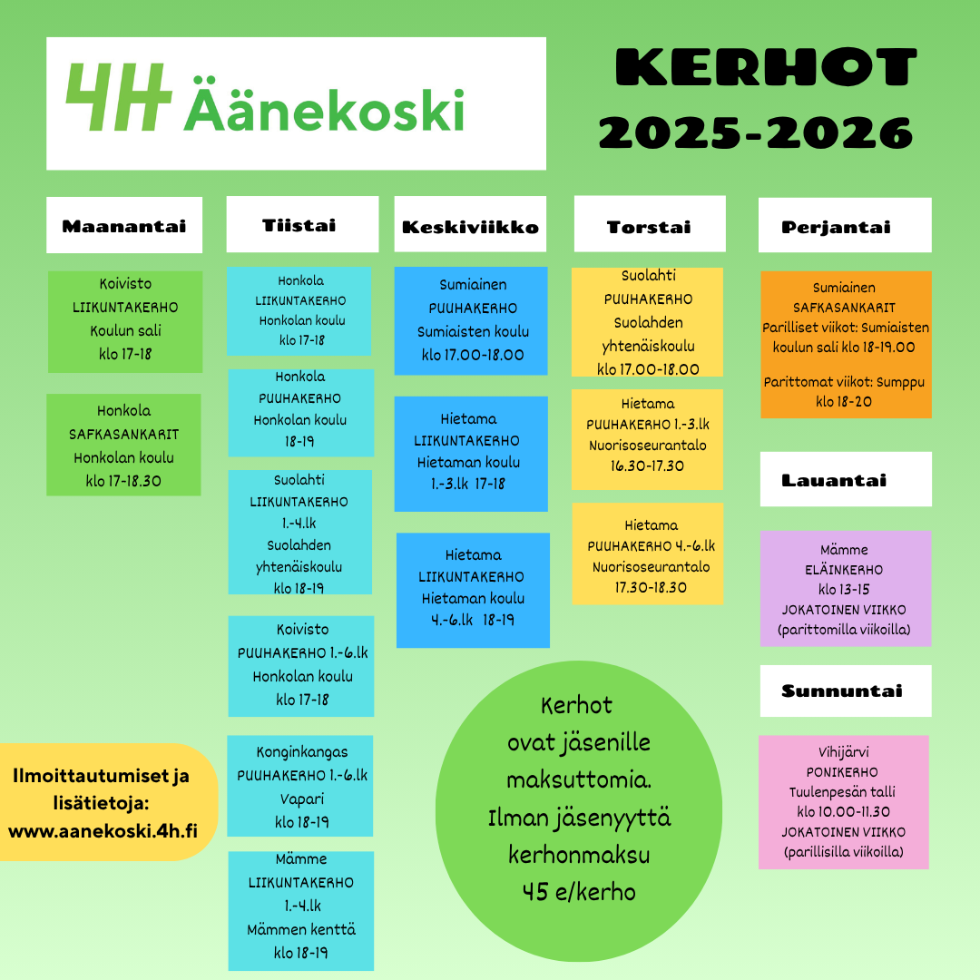 4H-kerhot ovat matalan kynnyksen harrastustoimintaa, jonne jokainen lapsi on tervetullut. Kerhotoiminta on tarkoitettu 6-12-vuotiaille lapsille.