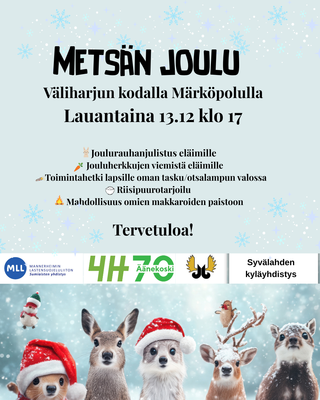 Tervetuloa Metsän Jouluun! Lauantaina 13.12. klo 17 Väliharjun kodalle Märköpolulle kokoonnutaan nauttimaan joulun tunnelmasta luonnon keskellä. Seuraa Sumiaisten tieltä opasteita hiekkamontun viereen…