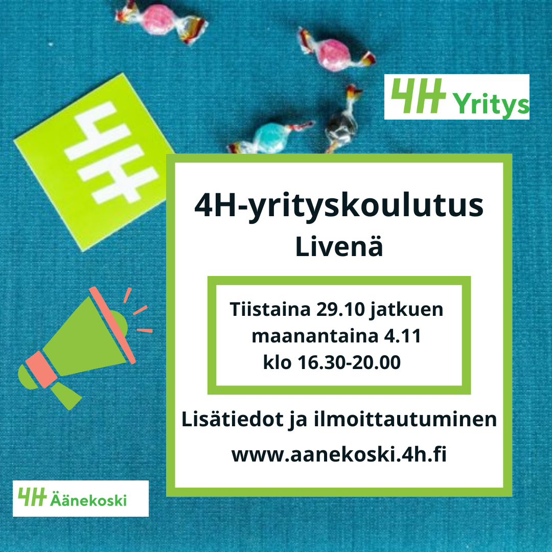 Ilmaisessa kahden illan koulutuksessa käydään läpi yrittäjyyden perusteita ja saat valmiuden oman 4H-yrityksen perustamiseen halutessasi! Koulutus on suunnattu 13-28-vuotiaille.