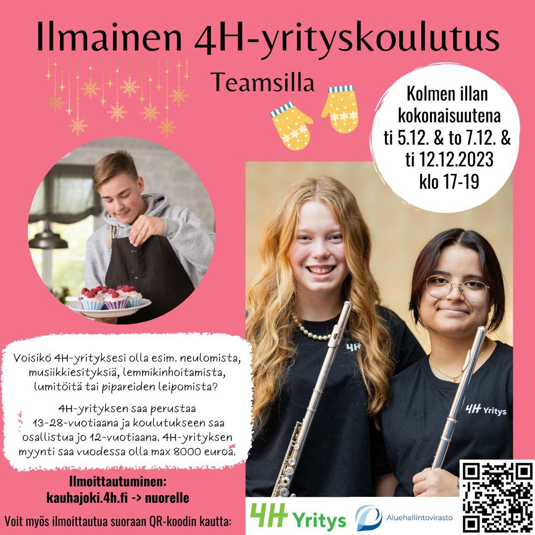 Kolmen illan kokonaisuudessa saat valmiudet oman 4H-yrityksen perustamiseen! Koulutuksessa käydään läpi oman yritysidean keksimistä ja kehittämistä, hinnoittelua ja kannattavuutta, markkinointia sekä yrittäjyyteen liittyviä paperihommia.