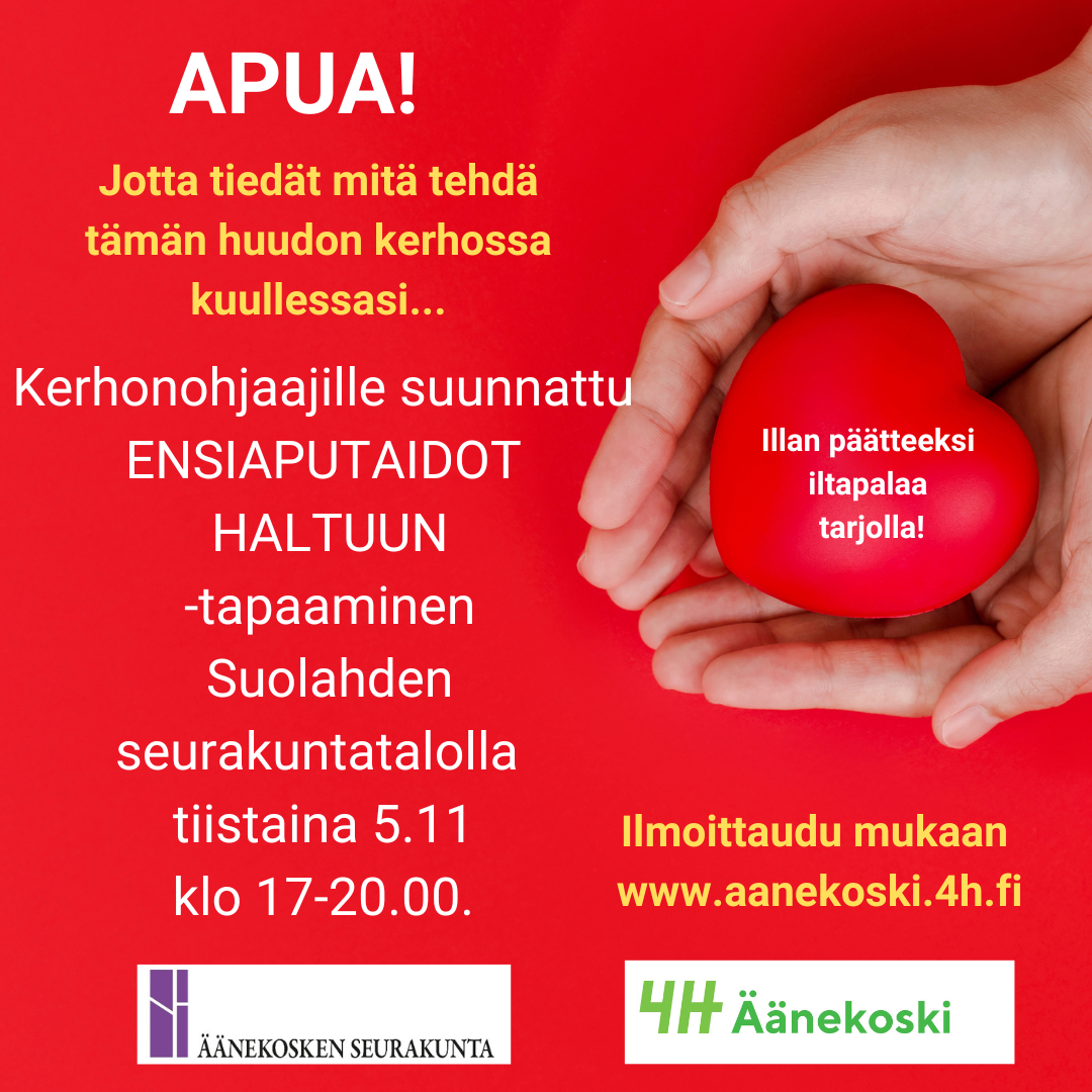 Kerhonohjaajillemme suunnattu tapaaminen, jossa opastusta vahinkotilanteiden varalle. Kokoonnumme Suolahden seurakuntatalolla osoitteessa Pajakatu 9.