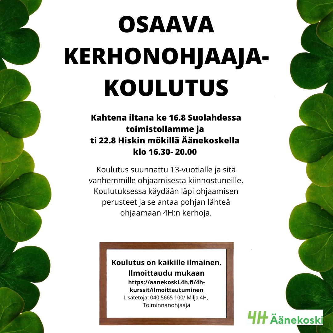 13-vuotiaille ja sitä vanhemmille suunnattu koulutus, joka antaa perustaidot 4H-kerhon ohjaamiseen. Koulutuksessa käydään läpi ohjaamisen perusteita, huomioon otettavia turvallisuusasioita ja perehdytään suunnitteluun. Koulutus on yhden opintopisteen arvoinen ja ilmainen.
