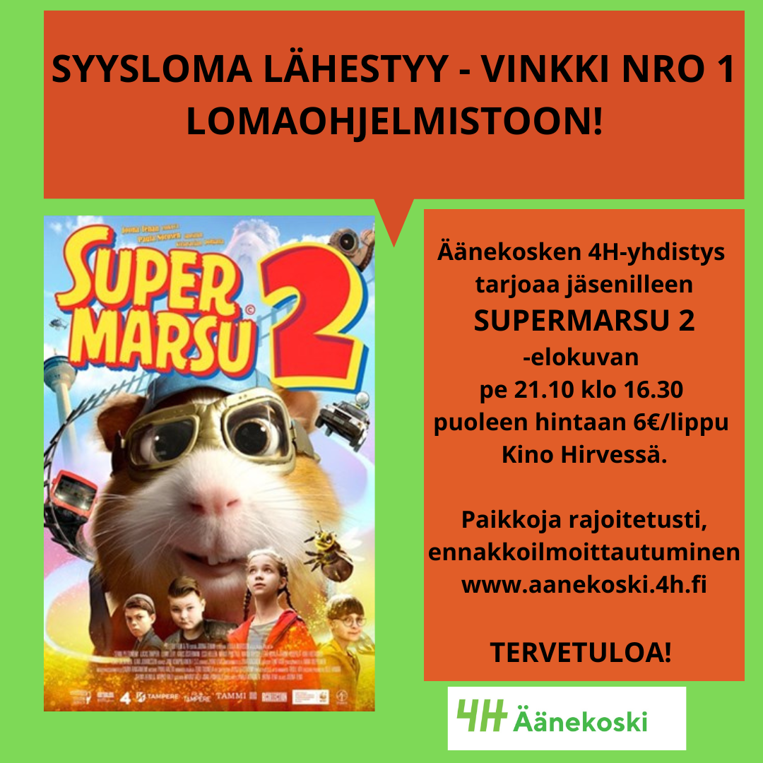 Äänekosken 4H-Yhdistyksen jäsenet saavat lipun näytökseen puoleen hintaan 6€/kpl (Norm 12€). Näytökseen tulee ilmoittautua ennakkoon täällä. Mukaan mahtuu 100 ensimmäistä.